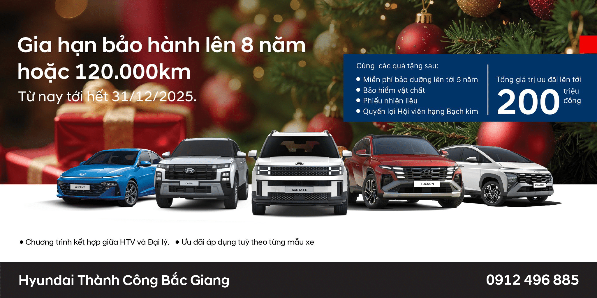 Bước sang tháng 12/2025, Hyundai Thành Công tiếp tục triển khai hàng loạt chương trình ưu đãi hấp dẫn nhằm thúc đẩy doanh số trong giai đoạn cao điểm cuối năm, bao gồm: chính sách bảo hành mở rộng 8 năm/120.000km (tùy điều kiện nào đến trước), ưu đãi giá bán lên đến 200 triệu đồng và hỗ trợ lãi suất từ 0%.